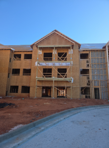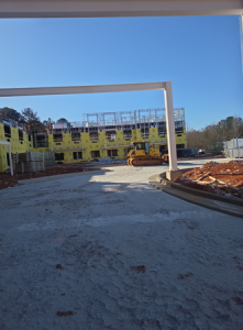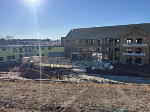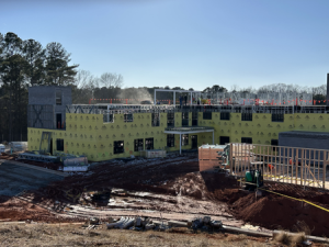 Schedule Update: Work was slow the first half of this week due to icy weather but work picked back up late week. Wood framers continued roof and wall sheeting in Area B. Metal framers are setting 3rd floor walls Areas A and B. Plumbers started rough ins in Area B.